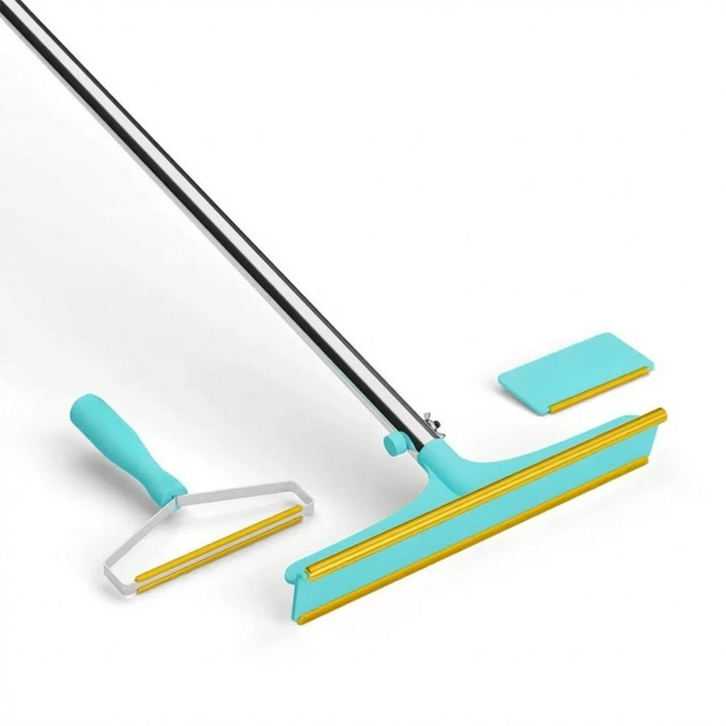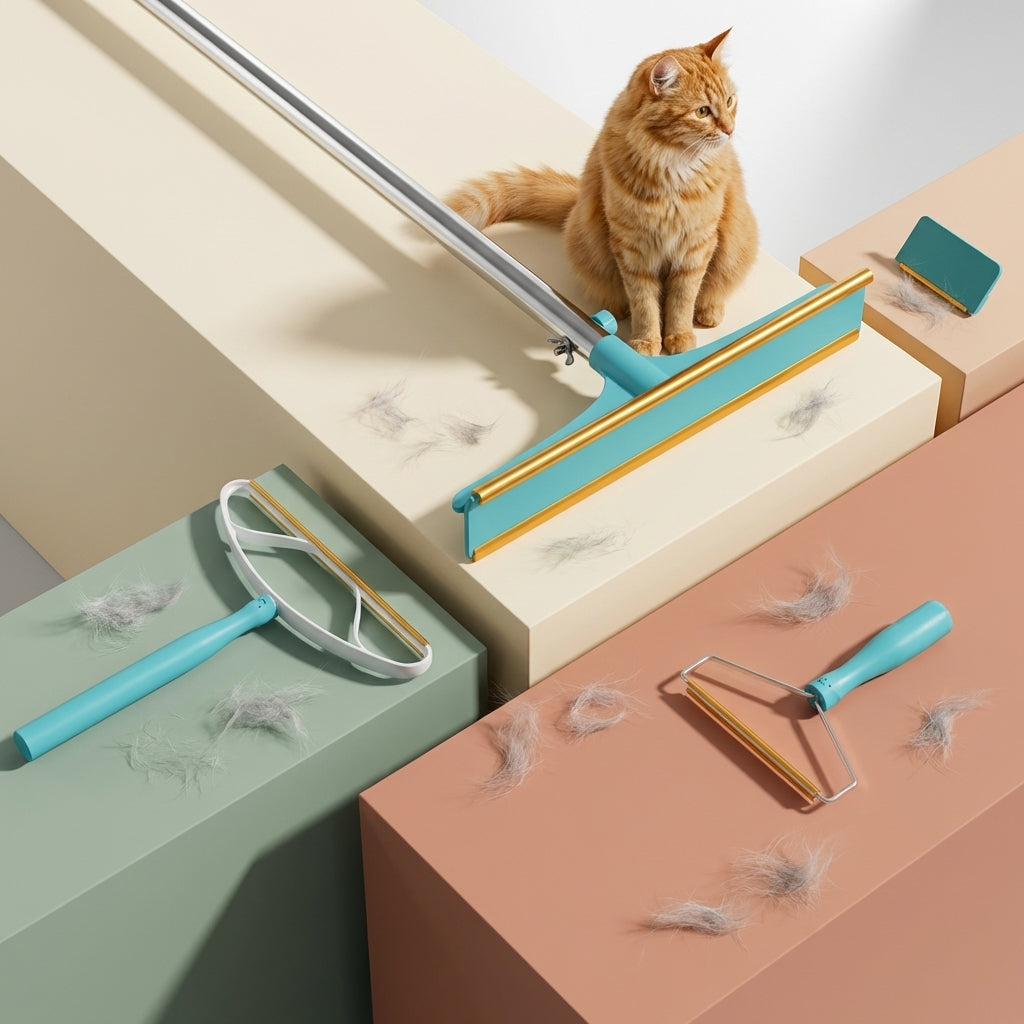 The compact scraper fits in your palm and reaches the spots everything else misses: car seats, stair edges, couch cushion corners. The mid-size roller digs into upholstery and clothing fabric, pulling out the fur that's worked its way deep into the weave. The wide carpet rake is double the coverage of a standard tool — fewer strokes, more fur, done faster.